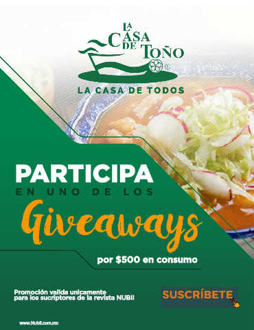 PARTICIPA Giveaways E N UN O D E L O S por $500 en consumo Promoción valida unicamente SUSCRÍBETE para los sucriptores de la revista NUBII www.Nubii.com.mx